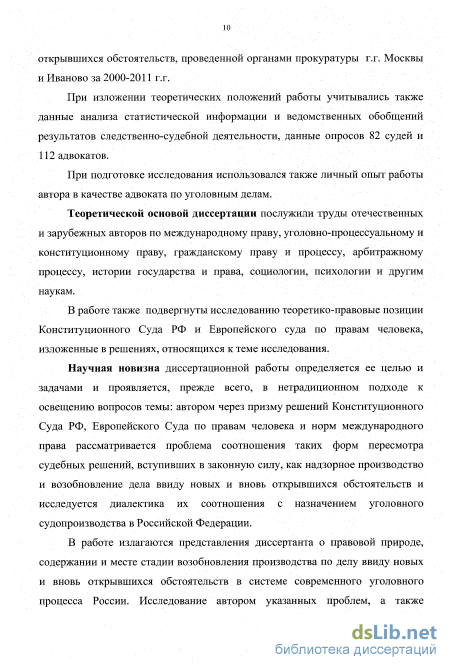 При изложении теоретических положений работы учитывались также данные анализа официальной статистической информации и ведомственных обобщений результатов следственно-судебной практики расследования вновь открывшихся (новых) обстоятельств и возобновления по ним производства по уголовным делам за 2000-2011 годы, данные социологических опросов 82 судей и 112 адвокатов (г. Москва и г. Иваново).