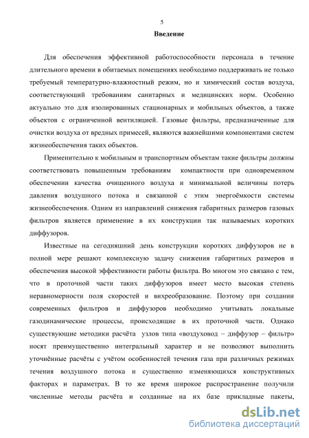 Таким образом, актуальность данной работы состоит в повышении газодинамической эффективности компактных газовых фильтров для систем жизнеобеспечения, то есть узлов «воздуховод - диффузор - фильтр» на базе усовершенствованных коротких диффузоров, созданных по результатам теоретических и экспериментальных исследований процессов течения воздушного потока в таких узлах.