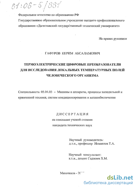 Диссертация подводит итог комплексу исследований, выполненных автором за последние 5 лет в Дагестанском государственном техническом университете (ДГТУ).