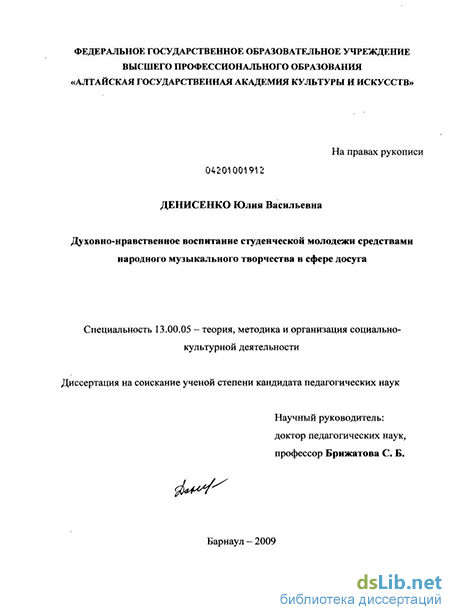 Актуальность темы исследования. Духовно-нравственное воспитание студенческой молодежи средствами народного музыкального творчества обусловлено как теоретическими, так и практическими задачами развития современной отечественной культуры, противоречивыми тенденциями в обществе, модернизацией роли учреждений культуры (социально-культурной сферы) и образования.