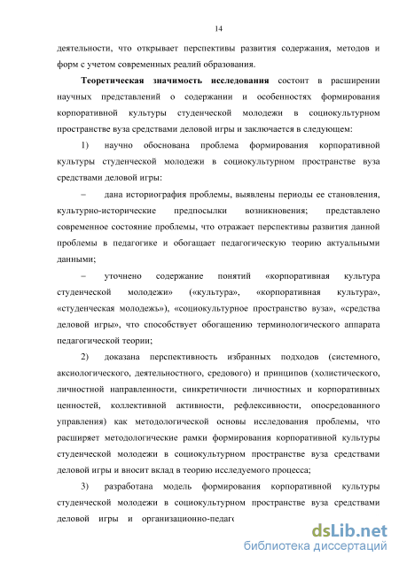 Актуальность обозначенной проблемы определила выбор темы диссертационного исследования: «Формирование корпоративной культуры студенческой молодежи в социокультурном пространстве вуза средствами деловой игры».