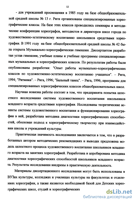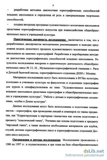 В ходе исследования диссертант использовал свой профессиональный опыт педагога-балетмейстера и руководителя Музыкально-хореографической гимназии.