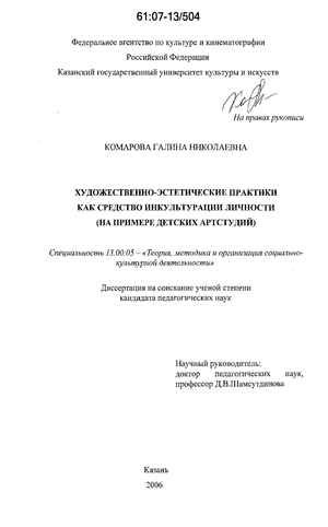 Диссертационное исследование осуществлялось в три этапа: первый этап (1999 - 2000 гг.) - определение объекта и предмета, гипотезы, цели и задач, изучение специальной литературы по проблеме; анализ и оценка современного состояния проблемы на основе изучения литературных источников, документов, программ; изучение опыта педагогов дополнительного образования и сферы досуга; выявление специфики процесса инкультурации средствами художественно-эстетических практик в условиях свободного времени; второй этап (2001-2004 гг.) ~ разработка общей концепции артстудии; реализация предложенной модели на базе Муниципального учреждения дополнительного образования детей «Центр внешкольной работы» Приволжского района г.Казани (участниками артстудии стали дети и подростки от 5 до 15 лет); проведение констатирующего эксперимента, обработка и анализ полученных результатов; третий этап (2005-2006 гг.) - проведение формирующего эксперимента; анализ эмпирического материала, его теоретическое осмысление; систематизация и обобщение результатов исследования (формулировка выводов и практических рекомендаций).