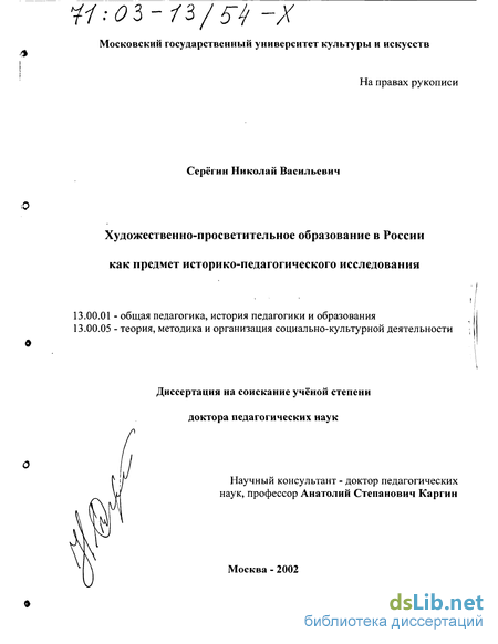 Исследования 90-х годов свидетельствуют о явном тяготении профессионального и общего образования к художественно-просветительным принципам. Об этом свидетельствуют также формирующиеся в обществе представления, тенденции, перспективы, вырабатываемые в правительстве концепции. Так Н.А.Паршиков в докторском исследовании определяет границы "сис темного подхода к основным видам деятельности в вузах культуры и искусств как сложного социокультурного и социально-педагогического явления, харак теризующегося междисциплинарностью, интегративностью и динамизмом, способностью исследования закономерностей и тенденций развития высшего культурологического, социально-культурного и художественно просветительного, этнохудожественного, библиографического и информационного образования". (334, с.9.) Обращает на себя внимание определение понятия диверсификации в сфере высшего профессионального образования. В докторской диссертации Е.Л.Кудриной оно представлено как "качественно новое социально-педагогическое явление, отражающее одно из направлений реформирования образования. Основными проявлениями диверсификации являются разностороннее изменение и развитие структурно-функциональных систем, перечня направлений, номенклатуры специальностей и уровней подготовки кадров, расширение базовых образовательных программ, систем, форм обучения, обеспе чивающих изменение видов, характера и содержания образовательных услуг, оказываемых в целях удовлетворения потребностей и запросов личности в образовании, изменение объёмов и механизмов формирования финансовых средств высших учебных заведений". (215, с.27-28.) Данное определение логически вытекает из анализа развития художественно-просветительных принципов на современном этапе и значительно обогащает их объект, цель, средства, результат. Одним из положений, выносимых на защиту в докторской диссертации В.П.Подвойского, представлены педагогические технологии преодоления профессиональной деформации руководителей социально-культурных учреждений, которые "проявляются как комплексная деятельность по организации, теоретическому и методологическому оснащению, практической реализации педагогической работы по формированию личностных возможностей, знаний, в контексте профессиональной деформации". (343, с. 12.) Системно-структурный анализ модели данного технологического процесса показывает идентичность со многими параметрами художественно-просветительной деятельности и соответствующего высшего образования. В качестве объекта докторского исследования К.Б.Соколова принята точка зрения на художественную культуру, как на систему, имеющую чрезвычайно сложную структуру. "Она включает в себя, по меньшей мере, четыре подсистемы: создание, сохранение, распространение и потребление художественных ценностей. Такое определение подразумевает, что искусство обретает статус художественной культуры в процессе своего социального функционирования. Сложилось и определённое представление о ведущих функциях художественной культуры в обществе: духовное развитие личности, формирование и удовлетворение её художественных потребностей, обогащение её сознания и деятельности". (440, с.4.) Социально-педагогический аспект этой философской концепции целиком вписывается в художественно-просветительну