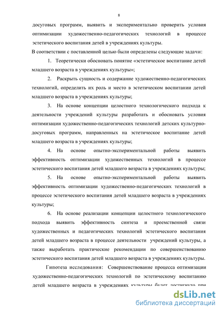 Цель исследования – теоретически обосновать сущность и содержание художественно – педагогических технологий детских культурно 8 досуговых программ, выявить и экспериментально проверить условия оптимизации художественно-педагогических технологий в процессе эстетического воспитания детей в учреждениях культуры. В соответствии с поставленной целью были определены следующие задачи: 1. Теоретически обосновать понятие «эстетическое воспитание детей младшего возраста в учреждениях культуры» 2. Раскрыть сущность и содержание художественно-педагогических технологий, определить их роль и место в эстетическом воспитании детей младшего возраста в учреждениях культуры 3. На основе концепции целостного технологического подхода к деятельности учреждений культуры разработать и обосновать условия оптимизации художественно-педагогических технологий детских культурно-досуговых программ, направленных на эстетическое воспитание детей младшего возраста в учреждениях культуры 4. На основе опытно-экспериментальной работы выявить эффективность оптимизации художественных технологий в процессе эстетического воспитания детей младшего возраста в учреждениях культуры 5. На основе опытно-экспериментальной работы выявить эффективность оптимизации художественно-педагогических технологий в процессе эстетического воспитания детей младшего возраста в учреждениях культуры 6. На основе реализации концепции целостного технологического подхода выявить эффективность синтеза и преемственной связи художественных и педагогических технологий эстетического воспитания детей младшего возраста в процессе деятельности учреждений культуры, а также выработать практические рекомендации по совершенствованию эстетического воспитания детей младшего возраста в учреждениях культуры.