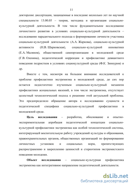Объект исследования - социально-культурная профилактика экстремизма как интегративное направление педагогической деятельности.