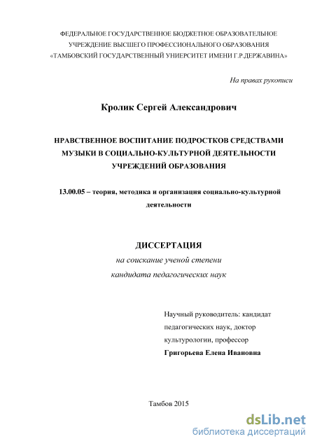 ГЛАВА I. Теоретические основы нравственного воспитания подростков средствами музыки в социально-культурной деятельности учреждений образования
