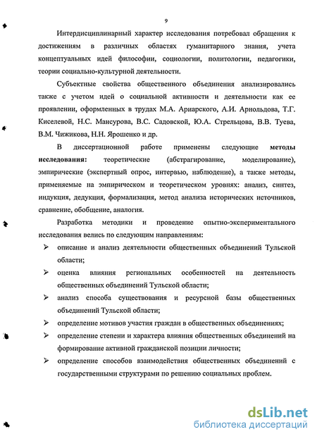 Интердисциплинарный характер исследования потребовал обращения к достижениям в различных областях гуманитарного знания, учета концептуальных идей философии, социологии, политологии, педагогики, теории социально-культурной деятельности.