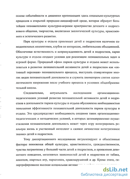 Однако в теории, методике и организации социально-культурной деятельности проблемные вопросы развития познавательной активности детей и подростков в условиях деятельности парков культуры и отдыха практически остаются неизученными, что и послужило основанием для выбора темы диссертационного исследования: «Организационно-педагогические условия развития познавательной активности детей и подростков в деятельности парков культуры и отдыха».