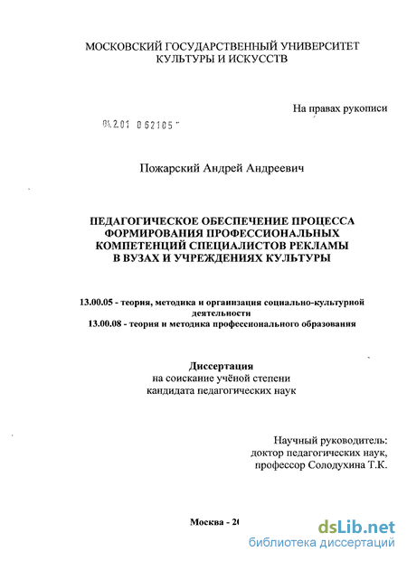 Предмет исследования: педагогическое обеспечение процесса формирования профессиональных компетенций-будущих специалистов рекламы в ходе их подготовки в вузах и учреждениях культуры.