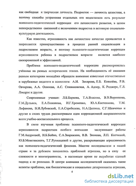 Однако, в особом исследовании и разработке сегодня нуждается содержание, приемы и методы психолого-педагогической коррекции агрессивности современных подростков, в настоящее время не исследован еще психолого-педагогический ресурс социокультурного пространства в решении данного вопроса.