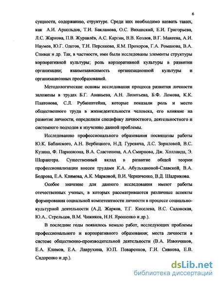 сущности, содержанию, структуре. Среди них необходимо назвать таких, как А.И. Арнольдов, Т.И. Бакланова, О.С. Виханский, Е.И. Григорьева, Л.С. Жаркова, П.В. Журавлёв, А.С. Каргин, В.В. Козлов, В.Г. Макеева, А.И. Наумов, Ю.Г. Одегов, Т.Н. Персикова, Я.М. Прохоров, Г.А. Романова, В.А. Спивак и др. Так, в частности, ими были исследованы элементы структуры корпоративной культуры; роль корпоративной культуры в развитии организации; взаимозависимость организационной культуры и организационных преобразований.