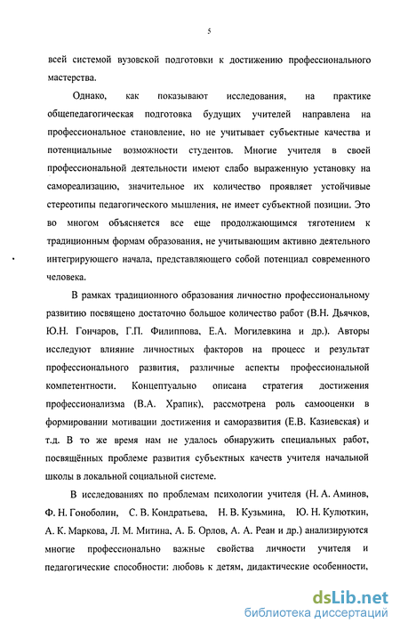 В рамках традиционного образования личностно профессиональному развитию посвящено достаточно большое количество работ (В.Н. Дьячков, Ю.Н. Гончаров, Г.П. Филиппова, Е.А. Могилевкина и др.). Авторы исследуют влияние личностных факторов на процесс и результат профессионального развития, различные аспекты профессиональной компетентности. Концептуально описана стратегия достижения профессионализма (В.А. Храпик), рассмотрена роль самооценки в формировании мотивации достижения и саморазвития (Е.В. Казиевская) и т.д. В то же время нам не удалось обнаружить специальных работ, посвященных проблеме развития субъектных качеств учителя начальной школы в локальной социальной системе.