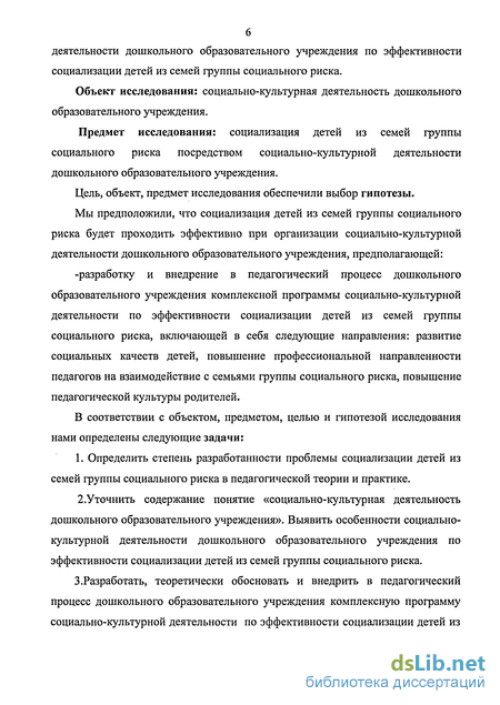 Предмет исследования: социализация детей из семей группы социального риска посредством социально-культурной деятельности дошкольного образовательного учреждения.