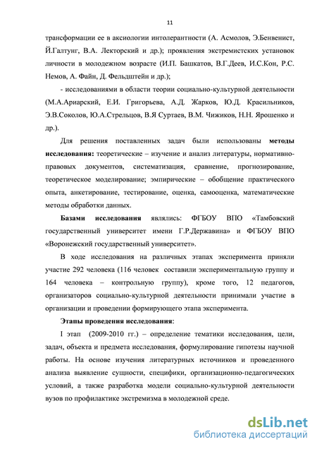 III этап (2011-2012 гг.) – проведение формирующего эксперимента, в ходе которого была разработана и апробирована педагогическая программа социально-культурной деятельности вузов по профилактике экстремизма в молодежной среде. На этом же этапе был проведен контрольный эксперимент.