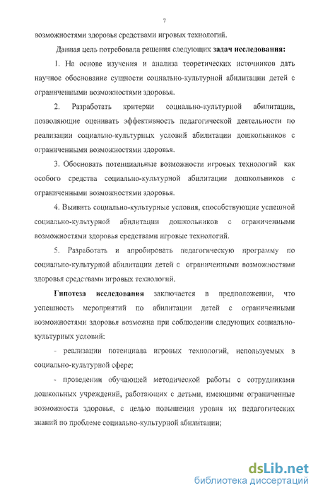 Тем не менее, несмотря на наличие многочисленных работ по проблемам педагогической и психологической поддержки детей с ограниченными возможностями здоровья, специальные исследования по проблеме социально-культурной абилитации дошкольников с ограниченными возможностями здоровья средствами игровых технологий отсутствуют.