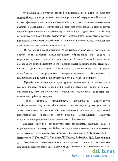 Однако систематические исследования проблемы формирования музыкальной культуры подростков как целостного феномена в учреждениях дополнительного образования до сих пор не осуществляются. В данном диссертационном исследовании сделана попытка обобщить, систематизировать и теоретически осмыслить весь комплекс подходов, теорий и представлений, связанных с изучением музыкальной культуры подростков, и на этой основе разработать теоретическую модель ее формирования в учреждениях дополнительного образования.