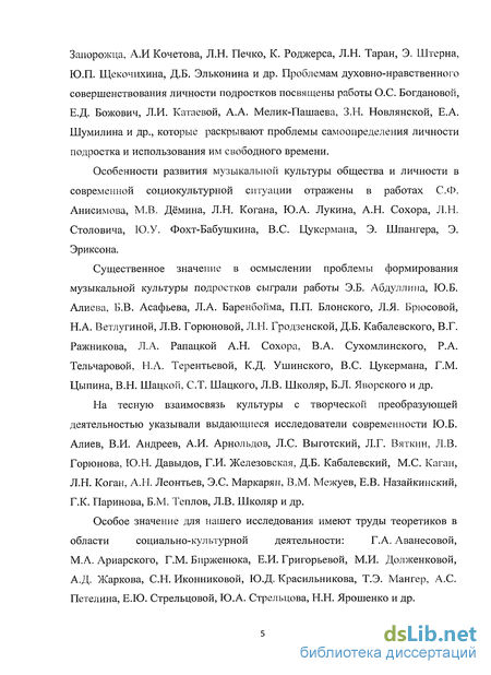Существенное значение в осмыслении проблемы формирования музыкальной культуры подростков сыграли для нас работы Э.Б. Абдуллина, Ю.Б. Алиева, Б.В. Асафьева, Л. А. Баренбойм, П.П. Блонского, Л.Я. Брюсовой, Н.А. Ветлугиной, Л.В. Горюновой, Л.Н. Гродзенской, Д.Б. Кабалевского, В.Г. Ражникова, Л.А. Рапацкой А.Н. Сохор, В.А. Сухомлинского, Р.А. Тельчаровой, Н.А. Терентьевой К.Д. Ушинского, B.C. Цукермана, Г.М. Цыпина, В.Н. Шацкой, С.Т. Шацкого, Л.В. Школяр, Б.Л. Яворского и др.