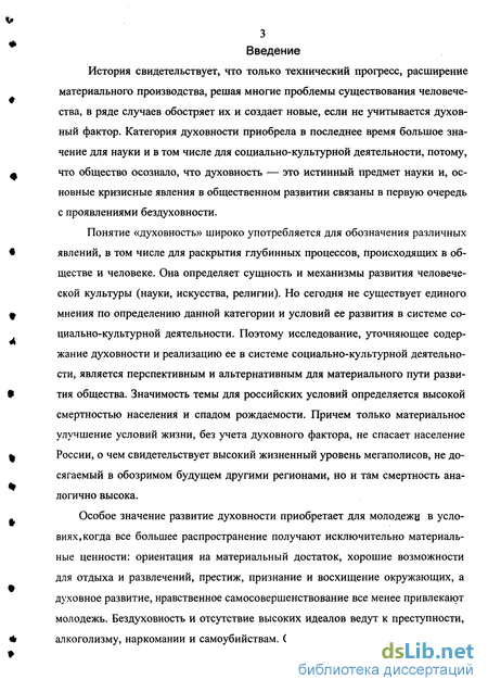 История свидетельствует, что только технический прогресс, расширение материального производства, решая многие проблемы существования человечества, в ряде случаев обостряет их и создает новые, если не учитывается духовный фактор. Категория духовности приобрела в последнее время большое значение для науки и в том числе для социально-культурной деятельности, потому, - что общество осознало, что духовность — это истинный предмет науки и, ос новные кризисные явления в общественном развитии связаны в первую очередь с проявлениями бездуховности.