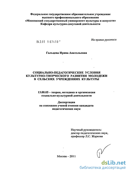 Актуальность темы, слабая ее разработанность и определили тему диссертационного исследования: «Социально-педагогические условия культурно-творческого развития молодежи в сельских учреждениях культуры».