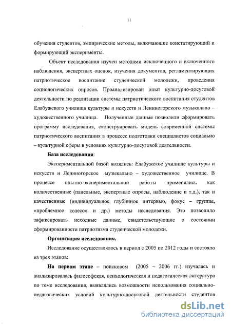 На первом этапе — поисковом (2005 - 2006 гг.) изучалась и анализировалась философская, психологическая и педагогическая литература по теме исследования, выявлялись возможности использования социально-педагогических условий культурно-досуговой деятельности студентов Елабужского училища культуры и искусств и Лениногорского училища с точки зрения патриотического воспитания; формировалась гипотеза и разрабатывалась программа экспериментального исследования.