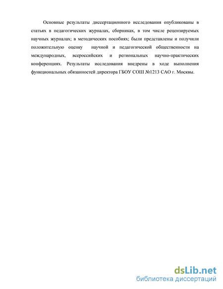 Основные результаты диссертационного исследования опубликованы в статьях в педагогических журналах, сборниках, в том числе рецензируемых научных журналах; в методических пособиях; были представлены и получили положительную оценку научной и педагогической общественности на международных, всероссийских и региональных научно-практических конференциях. Результаты исследования внедрены в ходе выполнения функциональных обязанностей директора ГБОУ СОШ №1213 САО г. Москвы.