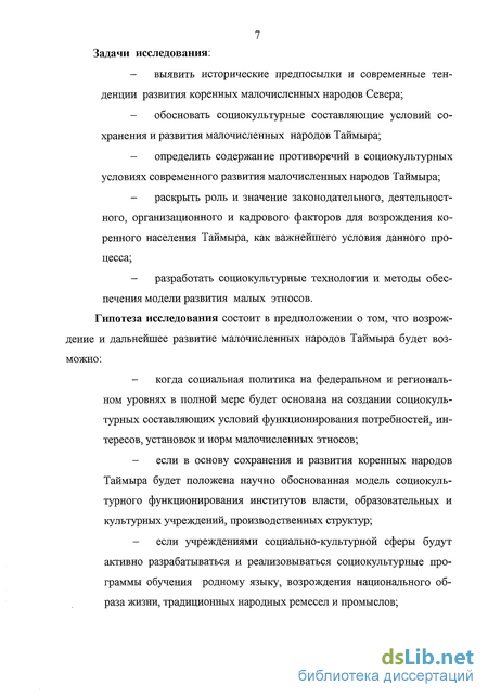 Вместе с тем следует отметить, что социокультурные аспекты проблемы развития малочисленных народов изучены не в полной мере, а специально эти вопросы применительно к условиям развития аборигенных народов Таймыра еще вообще не рассматривались. Все это и послужило основанием для выбора темы диссертации.
