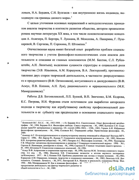 Отечественная наука имеет богатый опыт разработки проблем социального творчества с учетом философско-психологических схем анализа деятельности и описания ее главных компонентов (М.М. Бахтин, С.Л. Рубен-штейн, А.Н. Леонтьев); выделения сущности структуры и социальной роли творчества (Э.В. Ильенков, A.M. Коршунов, В.А. Лекторский); противопоставление двух сторон творческой деятельности, в частности: репродуктивного и продуктивного (В.Ф. Овчинников), интуитивного и дискурсивного (В.Ф. Асмус, П.В. Копнин, А.Н. Лук), рационального и иррационального (М.К. Мамардашвили).3