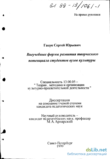 Содержательный анализ исследований проблем развития творческого потенциала личности в высшей школе показал, что преимущественное внимание авторов, как правило, ограничивалось изучением отдельных аспектов данного вопроса. Наличие нового социального заказа, с одной стороны, и недостаточная теоретическая и методологическая разработанность проблемы, с другой,- предопределили необходимость и целесообразность осуществления данного исследования, цель которого заключается в выявлении социально-педагогических условий эффективного использования внеучебных форм деятельности студентов вузов культуры для стимулирования и развития их творческих потенций.