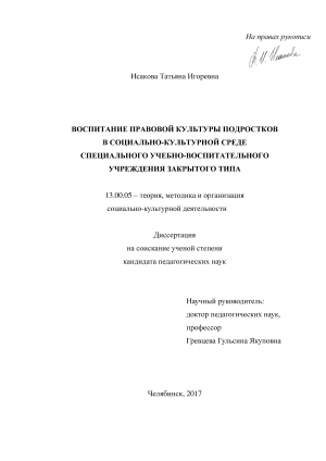Соответствие диссертации паспорту научной специальности. Представленные в исследовании теоретические положения о воспитании правовой культуры подростков в социально-культурной среде СУВУ соответствуют п. 1, 3, 4 и 5 паспорта специальности 13.00.05 – теория, методика и организация социально-культурной деятельности.