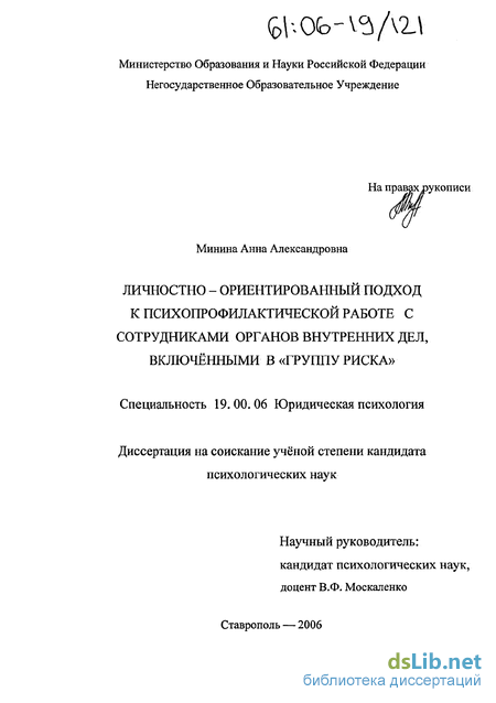 ориентированного подхода к психопрофилактической работе с сотрудниками «группы риска» и обусловила актуальность темы исследования, проблема которого сформулирована следующим образом: каково содержание личностно-ориентированного подхода к психопрофилактической работе с сотрудниками ОВД, включёнными в «группу риска»?