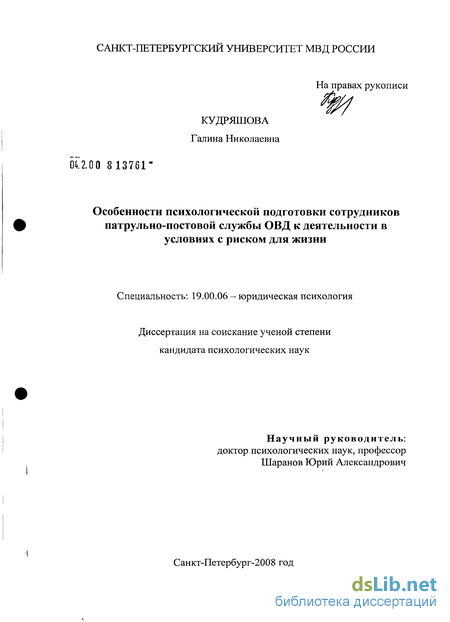 Актуальность темы исследования. Особая значимость психологической подготовленности сотрудников патрульно-постовой службы органов внутренних дел определяется современным характером развития преступности и особенностями физического, психологического, информационного противоборства с нею в обычных и экстремальных условиях оперативно-служебной деятельности. В настоящее время к известным источникам угрозы общественной безопасности добавляются относительно новые, специфические факторы экстремальности — это различные формы проявления экстремизма и терроризма. Своевременное распознавание признаков подобных правонарушений и профессиональные действия по их пресечению требуют от сотрудников патрульно-постовой службы предельной собранности, бдительности, способности к быстрой смене режима деятельности и длительным психо-эмоциональным нагрузкам. Исследования А.И. Адаева [2004], Г.М. Истоминой [1999], М.И.Марьина [2001], А.Д. Сафронова [1998], Н.Н. Силкина [2003], показывают, что гибель и ранения значительного числа сотрудников (83%) являются следствием низкой психологической (89%) и профессиональной подготовленности (87%), неумения собраться в нужную минуту (73%). Неподготовленность к действиям в условиях неопределенности и риска для жизни вызывает отрицательные психические изменения (невроз, агрессивность, апатия, суицидальное поведение) у определенной части сотрудников. [И.В. Пажильцев, 2007]. Именно поэтому проблема формирования специальной психологической подготовленности сотрудников патрульно-постовой службы к деятельности в условиях риска для жизни приобретает особую актуальность.