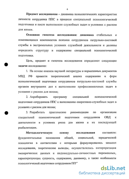 Основная гипотеза исследования: динамика стабильных и изменяющихся компонентов психики сотрудников патрульно-постовой службы в экстремальных условиях служебной деятельности и должны определять структуру и содержание специальной психологической подготовки.