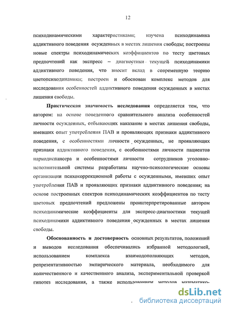 предпочтений как экспресс-диагностики текущей психодинамики аддиктивного поведения, что вносит вклад в современную теорию цветопсиходнпамики; построен и обоснован комплекс методов для исследования особенностей аддиктивного поведения осужденных в местах лишения свободы.