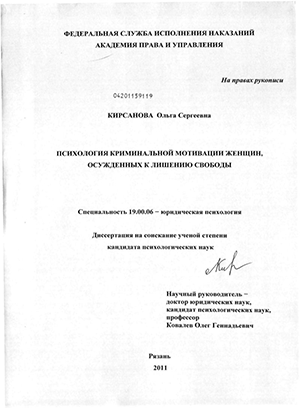 Научная новизна диссертационного исследования: выявлены особенности криминальной мотивации женщин, отбывающих наказание в виде лишения свободы, предложен психодиагностический инструментарий для определения качественных и количественных характеристик криминальной мотивации осужденных женщин, осуществлена их классификация по типам криминальной мотивации и степени криминальной зараженности, предложен и апробирован психокоррекционный комплекс методов психологического воздействия на осужденных женщин с целью переориентации их криминальной мотивации, исправления и ресоциализации.