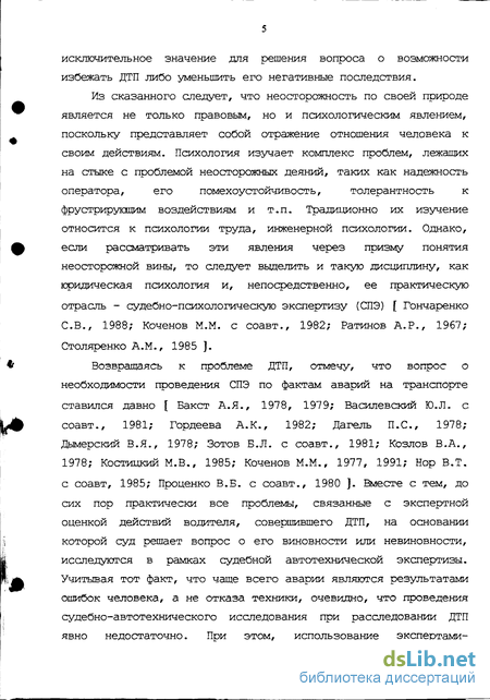 Возвращаясь к проблеме ДТП, отмечу, что вопрос о необходимости проведения СПЭ по фактам аварий на транспорте ставился давно [ Бакст А.Я., 1978, 1979; Вас шевский Ю.Л. с соавт., 1981; Гордеева А.К., 1982; Дагель П.С, 1978; Дьмерский В.Я., 1978; Зотов Б.Л. с соавт., 1981; Козлов В.А., 1978; Костицкий М.В., 1985; Коченов М.М., 1977, 1991; Нор В.Т. с соавт, 1985; Проценко В.Б. с соавт., 1980 ]. Вместе с тем, до сих пор практически все проблемы, связанные с экспертной оценкой действий водителя, совершившего ДТП, на основании которой суд решает вопрос о его виновности или невиновности, исследуются в рамках судебной автотехнической экспертизы. Учитывая тот факт, что чаще всего аварии являются результатами ошибок человека, а не отказа техники, очевидно, что проведения судебно-автотехнического исследования при расследовании ДТП явно недостаточно. При этом, использование экспертами автотехниками в качестве единственного критерия "человеческого фактора" времени реакции (ВР) (внедрение в 1983 году дифференцированного значения ВР было едва ли не революционным шагом) не может в полной мере разрешить проблему определения возможности конкретного водителя в конкретной ситуации предотвратить ДТП1. Тем более, что дифференцированные значения ВР, используемые в настоящее время, рассчитывались в зависимости от особенностей дорожно-транспортной ситуации (ДТС), но не от индивидуально-психологических и психофизиоло:гических особенностей водителя [ Василевский Ю.Л. с