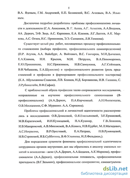 Для определения сущности феномена профессиональной идентичности сотрудников органов внутренних дел мы обратились к анализу смежных понятий в акмеологии - акче (А.А.Деркач, Л.А.Ьодалсв, А.К.Маркова), профессионал иім (А.А.Деркач), профессиональная готовность, профессиональная пригодность (В.Г.Зазыкин), профессиональное саморазвитие, самоактуалича- ция, самоопределение (Е. В. Селезнева), профессиональное самосознание (О.В.Москаленко), профессиональное самопознание (Л.А.Степнова, Н.В.Афанасьсна), профессиональная саморегуляция (М.Ф.Сскач), субъект деятельности, познания н обшення (К.А.Абульханова-Славская. Л. Л. Бодал ей), профессиональная Я-концепция (В.С.Лглпов).