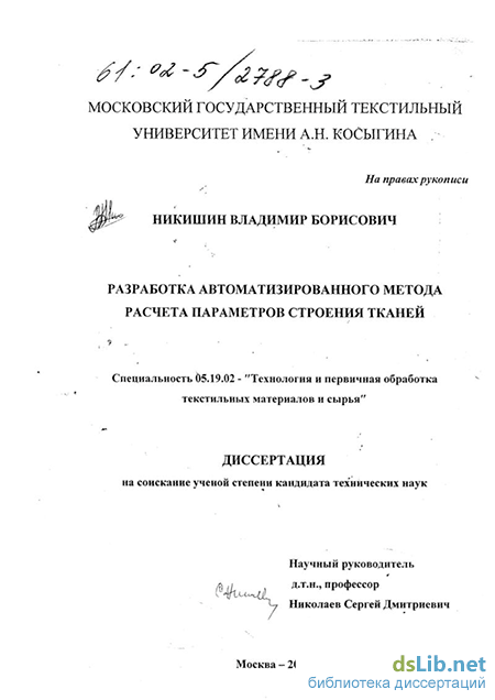 Никишин Владимир Борисович. Разработка автоматизированного метода расчета параметров строения тканей : диссертация ... кандидата технических наук : 05.19.02.- Москва, 2002.- 251 с.: ил. РГБ ОД, 61 02-5/2788-3