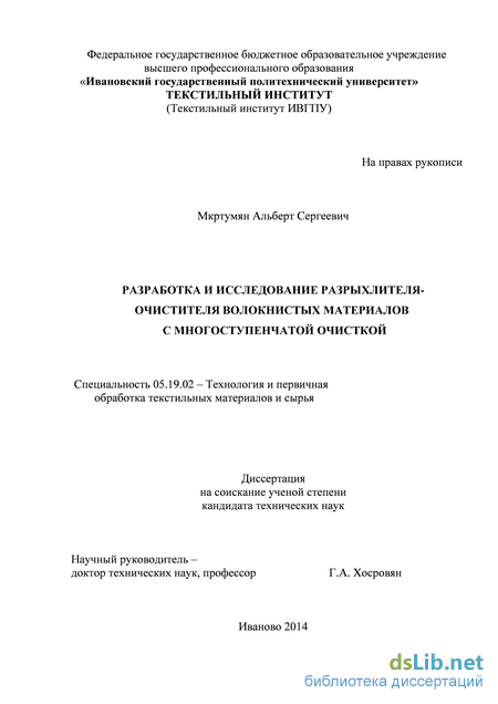 Личный вклад автора в получение результатов, изложенных в диссертации. Постановка задачи, выбор методов и направлений исследований, обобщение полученных результатов, теоретические положения и выводы диссертации принадлежит автору. Выбор и разработка методик аналитического и экспериментального исследования при определении характера изменения плотности волокнистых смесей от давления, а также при определении эффективности использования разработанного разрыхлителя-очистителя с многоступенчатой очисткой в технологической линии на технологические показатели вырабатываемого полуфабриката и пряжи выполнены автором при участии научного руководителя.