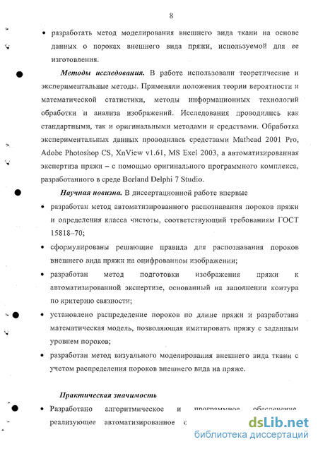 5 Исследования проводились как стандартными, так и оригинальными методами и средствами. Обработка экспериментальных данных проводилась средствами Mathcad 2001 Pro, Adobe Photoshop CS, XnView vl.61, MS Exel 2003, а автоматизированная экспертиза пряжи с помощью оригинального программного комплекса разработанного в среде Borland Delphi 7 Studio.