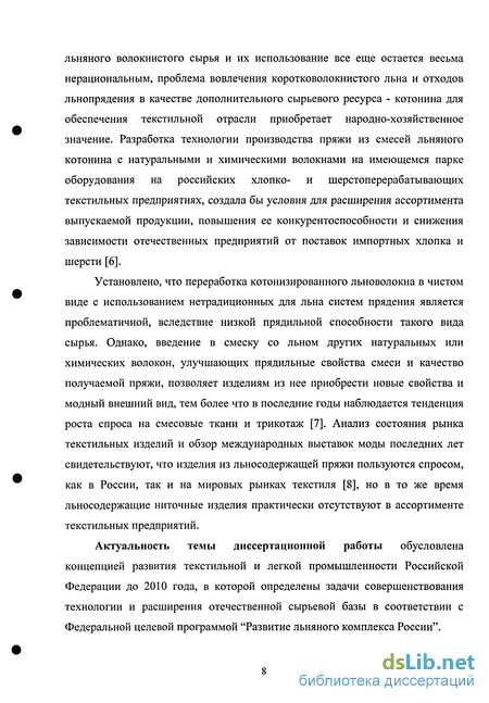 льняного волокнистого сырья и их использование все еще остается весьма нерациональным, проблема вовлечения коротковолокнистого льна и отходов льнопрядения в качестве дополнительного сырьевого ресурса - котонина для обеспечения текстильной отрасли приобретает народно-хозяйственное значение. Разработка технологии производства пряжи из смесей льняного котонина с натуральными и химическими волокнами на имеющемся парке оборудования на российских хлопко- и шерстоперерабатывающих текстильных предприятиях, создала бы условия для расширения ассортимента выпускаемой продукции, повышения ее конкурентоспособности и снижения зависимости отечественных предприятий от поставок импортных хлопка и шерсти [6].