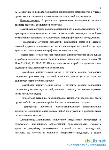 - разработаны новые способы соединения нижних участков оката рукава и проймы стана, образующие горизонтальные участки, получены патенты РФ №№ 2326996, 2326997, 2326998 на технологию выработки цельновязаных изделий с использованием этих соединений;