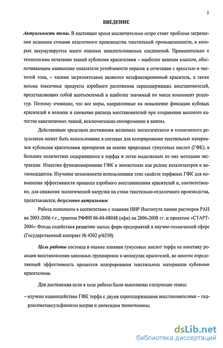 Действенным средством достижения желаемых экологического и технического результатов может быть использование в составах для колорирования текстильных материалов кубовыми красителями препаратов на основе природных гумусовых кислот (ГФК), в больших количествах содержащихся в торфах и легко выделяемых из них методами экстракции Известно функционирование ГФК в экосистемах как редокс катализаторов и ан-тиоксидантов. Изучение возможности использования этих свойств торфяных ГФК для повышения эффективности процесса аэробного восстановления красителей и, соответственно, для снижения экологической нагрузки на стоки текстильно-отделочного производства, представляется, безусловно актуальным