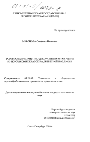 Место проведения. Работа выполнена на кафедре технологии деревообработки Санкт-Петербургской государственной лесотехнической академии. Экспериментальная часть проведена в Санкт-Петербургском государственном технологическом институте (технический университет) на кафедре органических покрытий. Выражаю благодарность кафедрам за предоставленную возможность по выполнению работы. Особенно признательна канд. хим. наук Мусихину В. Л. за помощь.
