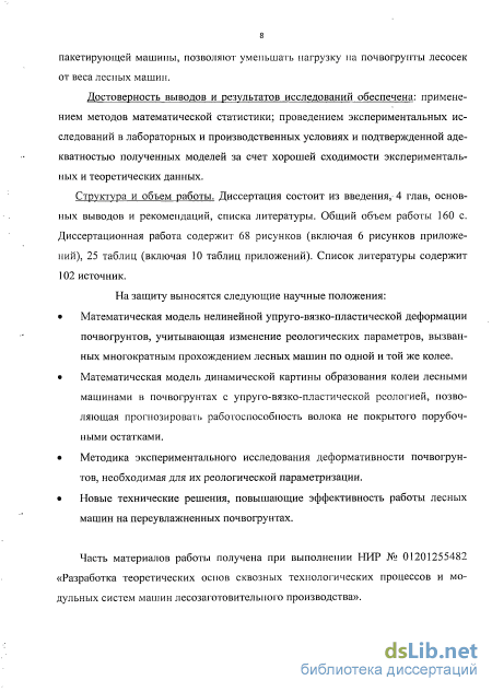 Научная новизна. Разработанная и исследованная математическая модель нелинейной упруго-вязко-пластической деформации почвогрунтов, учитывающая изменение их реологических параметров, вызванноое многократным прохождением лесных машин по одной и той же колее, позволяющая определять возможную работоспособность трасс трелевки, углубляет теорию взаимодействия лесных машин с поверхностью движения.