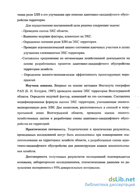 Научная новизна. Впервые на основе методики Института географии РАН (Б. И. Кочуров, 1987) проведена оценка ЭХС территории Волгоградской области. Определен ведущий фактор, влияющий на это состояние. Составлена модифицированная формула оценки ЭХС территории, учитывающая эколого-мелиоративную роль ЗЛН. Для полигонов, расположенных в степной- и полупустынной зонах Волгоградской области, проведена оценка эколого-хозяйственных систем и разработаны схемы адаптивно-ландшафтного обустройства их территорий.