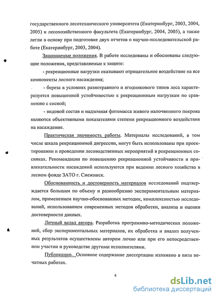 Практическая значимость работы. Материалы исследований, в том числе шкала рекреационной дигрессии, могут быть использованы при проектировании и проведении лесоводственных мероприятий в рекреационных сосняках. Рекомендации по повышению рекреационной устойчивости и привлекательности насаждений используются при ведении лесного хозяйства в лесном фонде ЗАТО г. Снежинск.