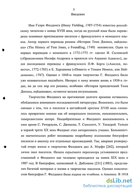 Творчество Филдинга на протяжении долгого времени оставалось обойденным вниманием исследователей литературы. Возможно, это было связано с тем, что о писателе в английской критике XVIII века сложилось превратное мнение как об аморальном писателе, неосновательном, поверхностном авторе. Неодобрительно о Филдинге высказывались в свое время С. Ричардсон, С. Джонсон, Т. Смоллетт, У. Теккерей. Только в первой трети XX века Филдинг стал интересовать ученых. Большинство значительных работ посвящены подробному изложению биографии писателя и анализу его отдельных произведений. Так, впервые развернутый очерк жизни и творчества Филдинга дал А. Мэрфи [262], который лично знал писателя. Начало серьезного пересмотра устоявшихся представлений о Филдинге как человеке приходится на конец XIX века и 1907 год. В биографии, написанной А. Добсоном [231] (1883), представлен богатый материал о жизни и творчестве писателя. Однако классическая биография Г. Филдинга была издана на чужбине, в Америке. В 1918
