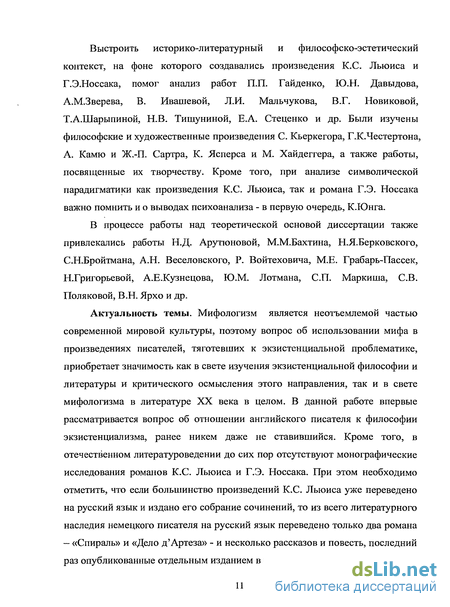Актуальность темы Мифологизм является неотъемлемой частью современной культуры, поэтому вопрос об использовании мифа в произведениях писателей, тяготевших к «экзистенциальной проблематике» приобретает значимость как в свете изучения экзистенциальной философии и литературы и критического осмысления этого направления, так и в свете мифологизма в литературе XX века в целом В данной работе впервые рассматривается вопрос об отношении английского писателя к философии экзистенциализма, ранее никем даже не ставившийся Кроме того, в отечественном литературоведении до сих пор отсутствуют монографические исследования романов К С Льюиса и Г Э Носсака Необходимо отметить, что если большинство произведений Льюиса уже переведено на русский язык и издано его собрание сочинений, то из всего литературного наследия Носсака на русском языке имеются только два романа - «Спираль» и «Дело д'Артеза» - и несколько рассказов и повесть, последний раз опубликованные отдельным изданием в 1983 году