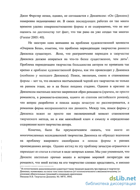 Конечно, было бы преувеличением сказать, что никто из многочисленных исследователей творчества Диккенса не обращал внимания на проблему жанрового своеобразия и поиска формы в ранних произведениях автора. Однако взгляд на эту проблему зачастую ограничен и переходит из статьи в статью в виде затертых клише. Мы уже упоминали, что Диккенс настолько прочно вошел в историю мировой литература как романист, что иной взгляд на его творчество сложно представить, и именно